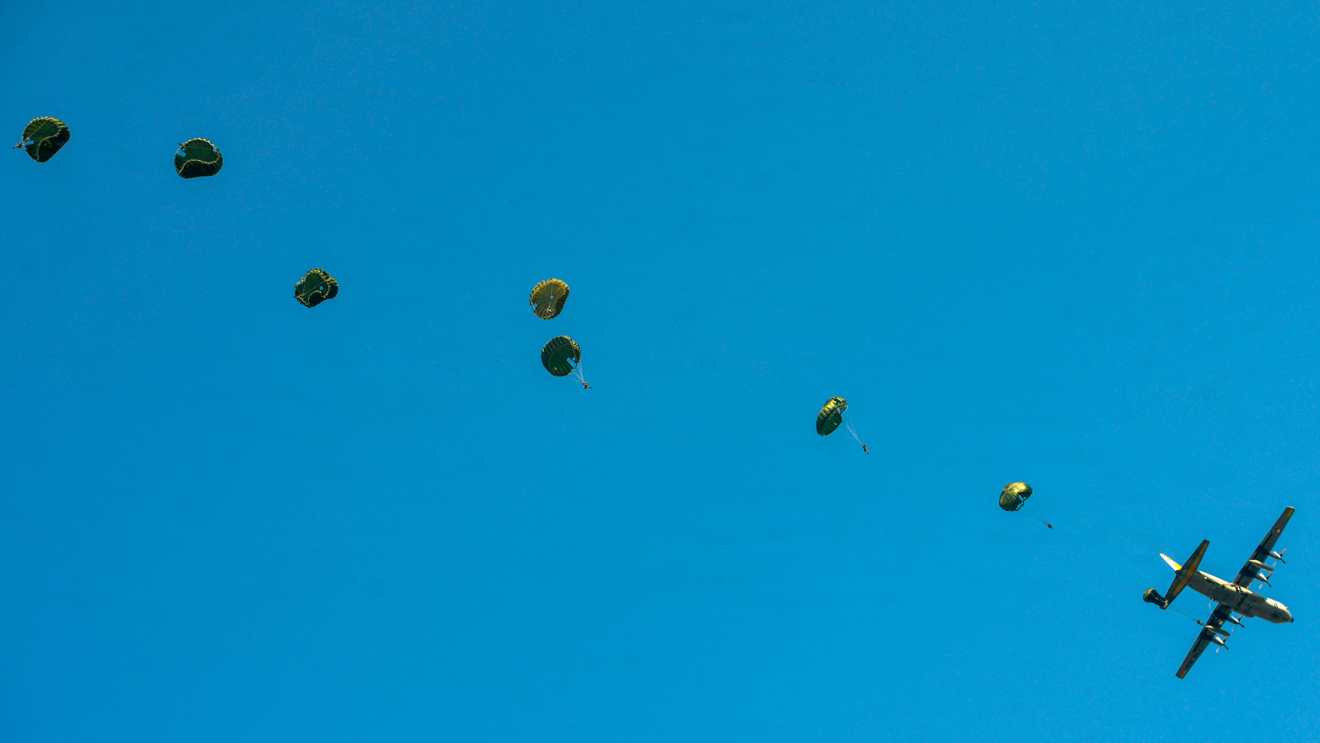Indonesian air force soldiers parachute during a military drill at Blang Bintang, Aceh province on February 8, 2019. (CHAIDEER MAHYUDDIN/AFP/Getty Images)