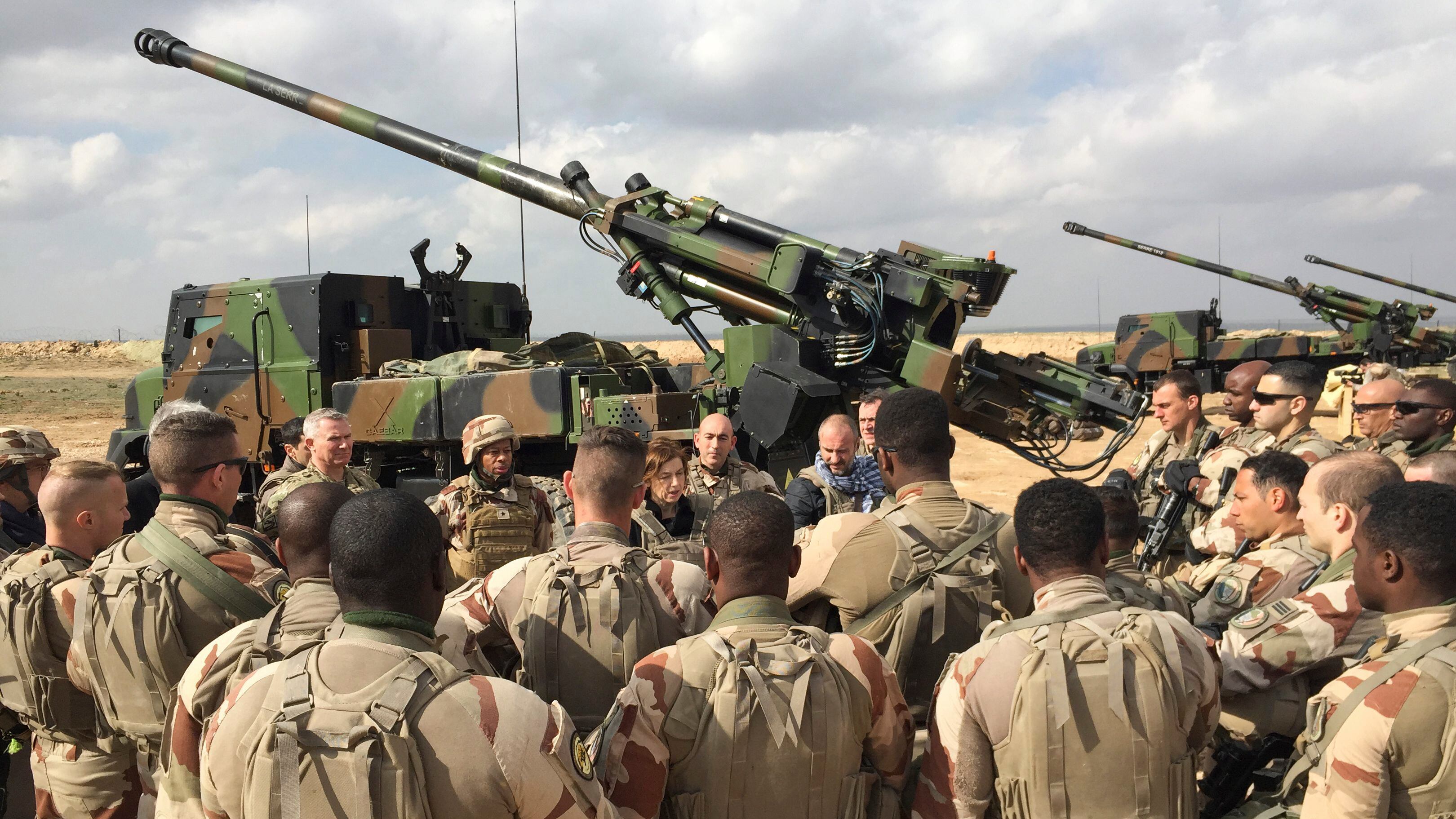 French Defense Minister Florence Parly (C) talks to French soldiers engaged in "Operation Chammal", the French military operation within "Operation Inherent Resolve", the international coalition against the Islamic State (IS) group, as they stand in front of wheeled 155 mm gun-howitzer CAESAR system on February 9, 2019, near Al-Qaim, a few kilometres away from the last scrap of territory held by IS in eastern Syria. - The US-backed Syrian Democratic Forces said on February 9, 2019 it had begun the "final battle" to oust the Islamic State group from the last scrap of territory it holds in eastern Syria. (DAPHNE BENOIT/AFP/Getty Images)