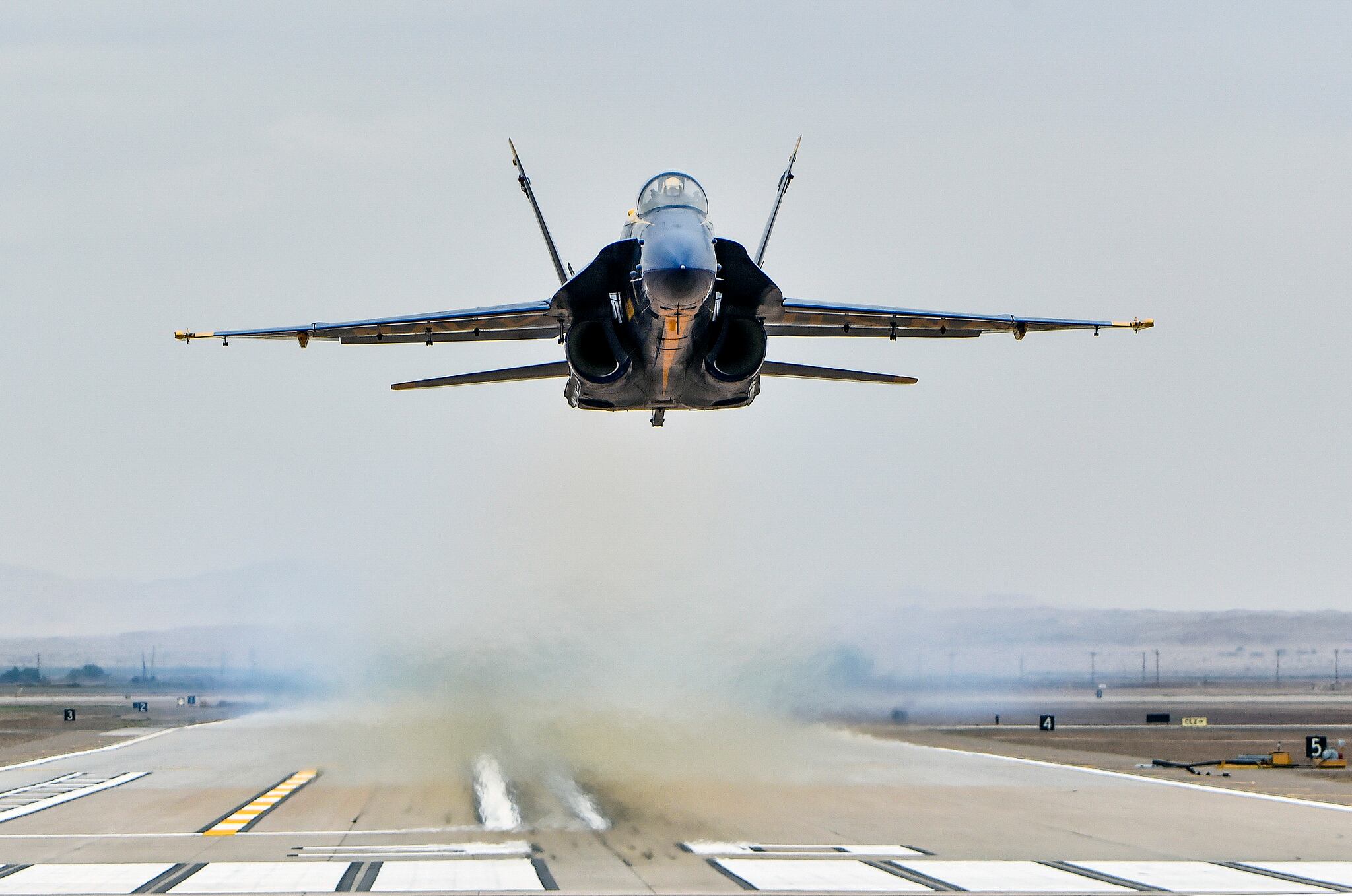 Opposing solo pilot Lt. Cmdr. Andre Webb, assigned to the U.S. Navy Flight Demonstration Squadron, the Blue Angels, performs a low transition take off during a practice demonstration on Feb. 2, 2019, at Naval Air Facility El Centro, Calif. (Mass Communication Specialist 2nd Class Timothy Schumaker/Navy)