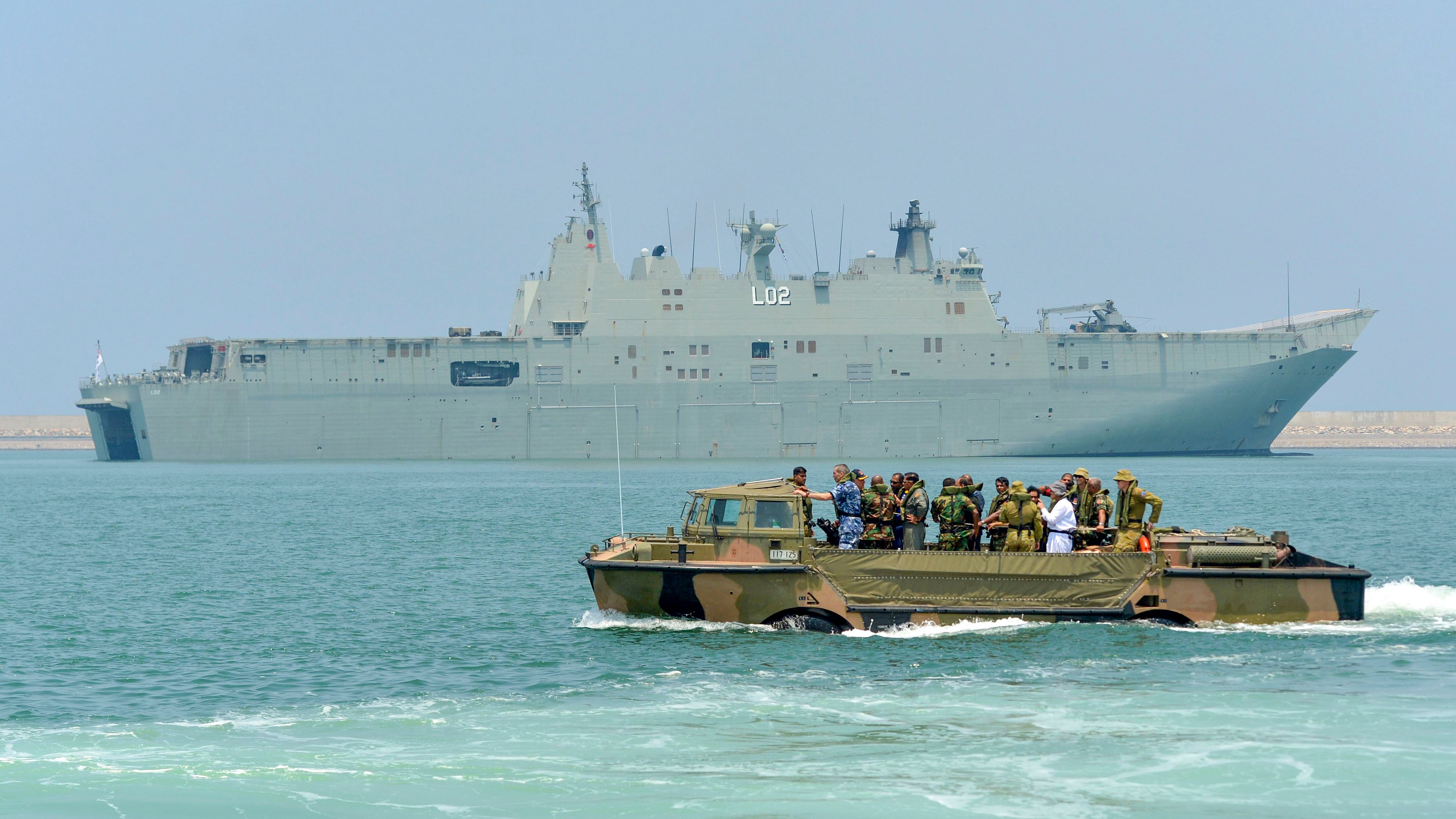 An Australian Army Lighter amphibious resupply cargo (LARC) vehicle carrying army personnel takes part in training exercise in the Sri Lankan capital Colombo on March 26, 2019. - Some 1,000 Australian security personnel in four naval ships and a military aircraft are participating in the biggest joint exercise yet with their Sri Lankan counterparts. (ISHARA S. KODIKARA/AFP/Getty Images)