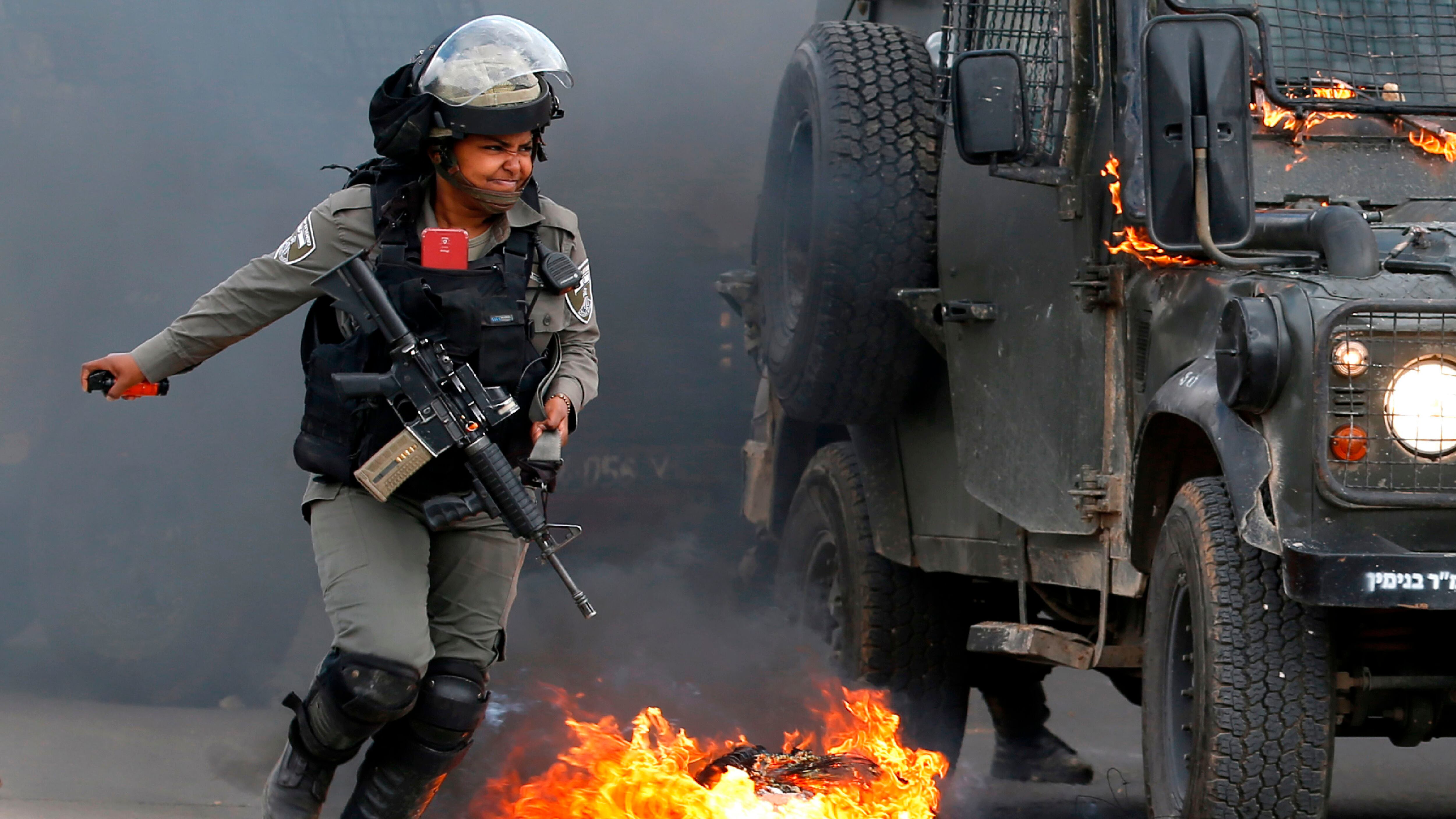 A member of the Israeli security forces runs next to a military jeep set on fire by Molotov cocktails launched by Palestinian protesters during a demonstration on the outskirts of Ramallah in the occupied West Bank on March 27, 2019, in support of Palestinian prisoners held in Israeli jails. (ABBAS MOMANI/AFP/Getty Images)