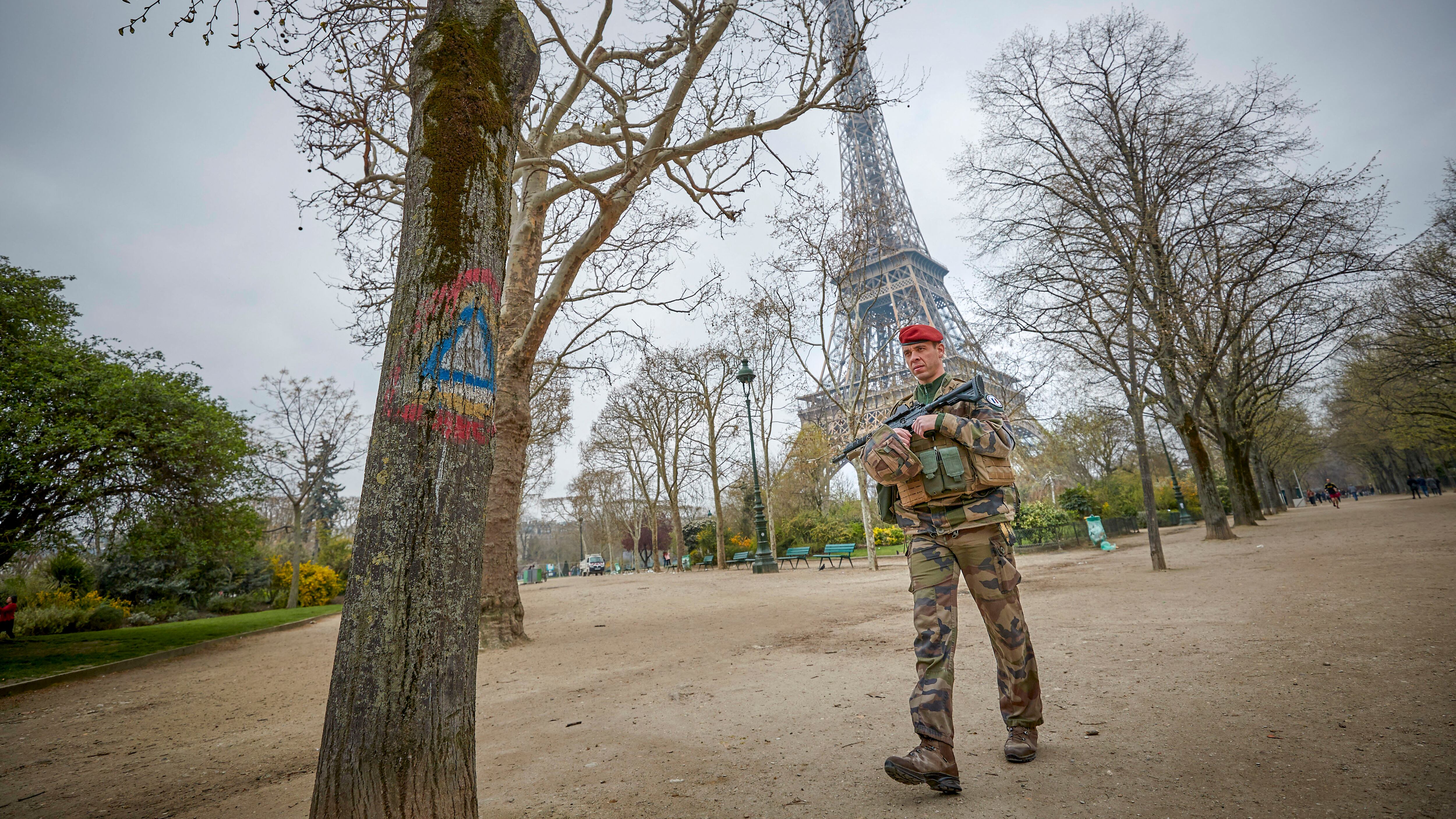 French Army soldiers of Operation Sentinelle patrol around the Eiffel Tower during Act 19 of Gilets Jaunes or ‘Yellow Vest’ protests on March 23, 2019 in Paris, France. After last week’s violent protests on the Champs-Elysees, the Minister of the Interior, Christophe Castaner announced zero tolerance in a bid to avoid a repeat, banning protests on the Champs Elysees and mobilizing the Army’s Sentinelle anti-terrorist unit, in an unprecedented mobilization of the army in France since the Algerian war. (Photo by Kiran Ridley/Getty Images)