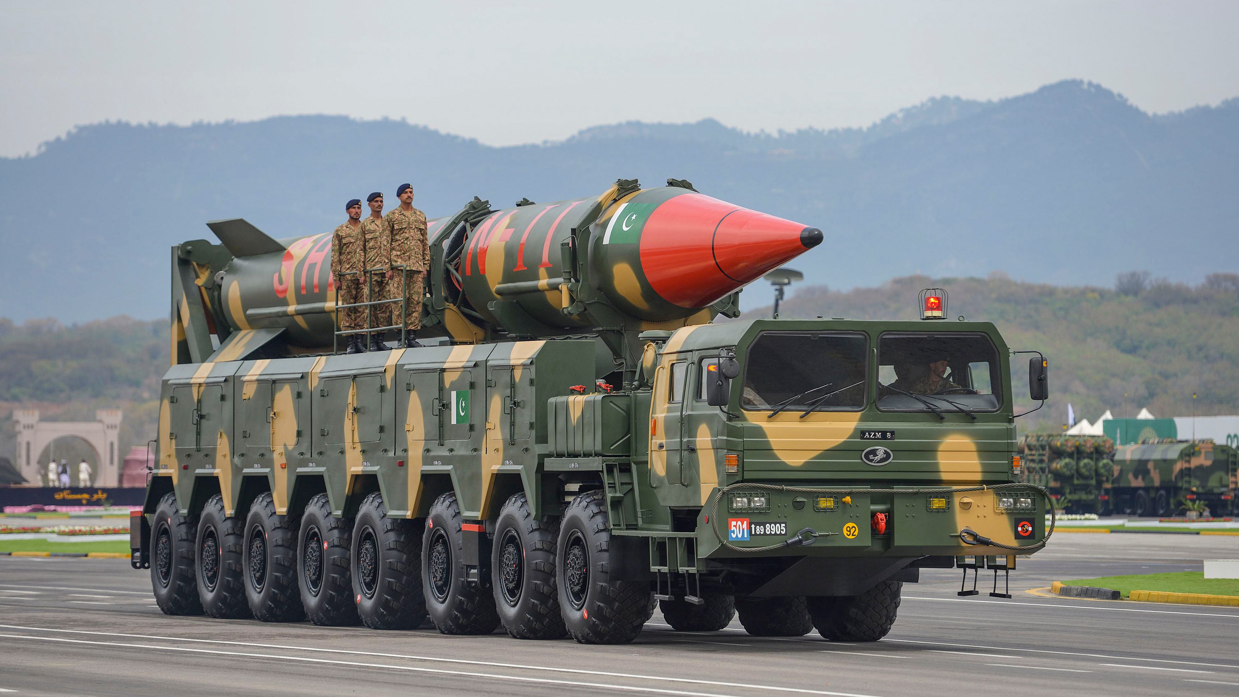 Pakistani army soldiers travel on a vehicle carrying a long-range ballistic Shaheen II missile during the Pakistan Day parade in Islamabad on March 23, 2019. - Pakistan National Day commemorates the passing of the Lahore Resolution, when a separate nation for the Muslims of The British Indian Empire was demanded on March 23, 1940. (Photo by FAROOQ NAEEM / AFP) (Photo credit should read FAROOQ NAEEM/AFP/Getty Images)
