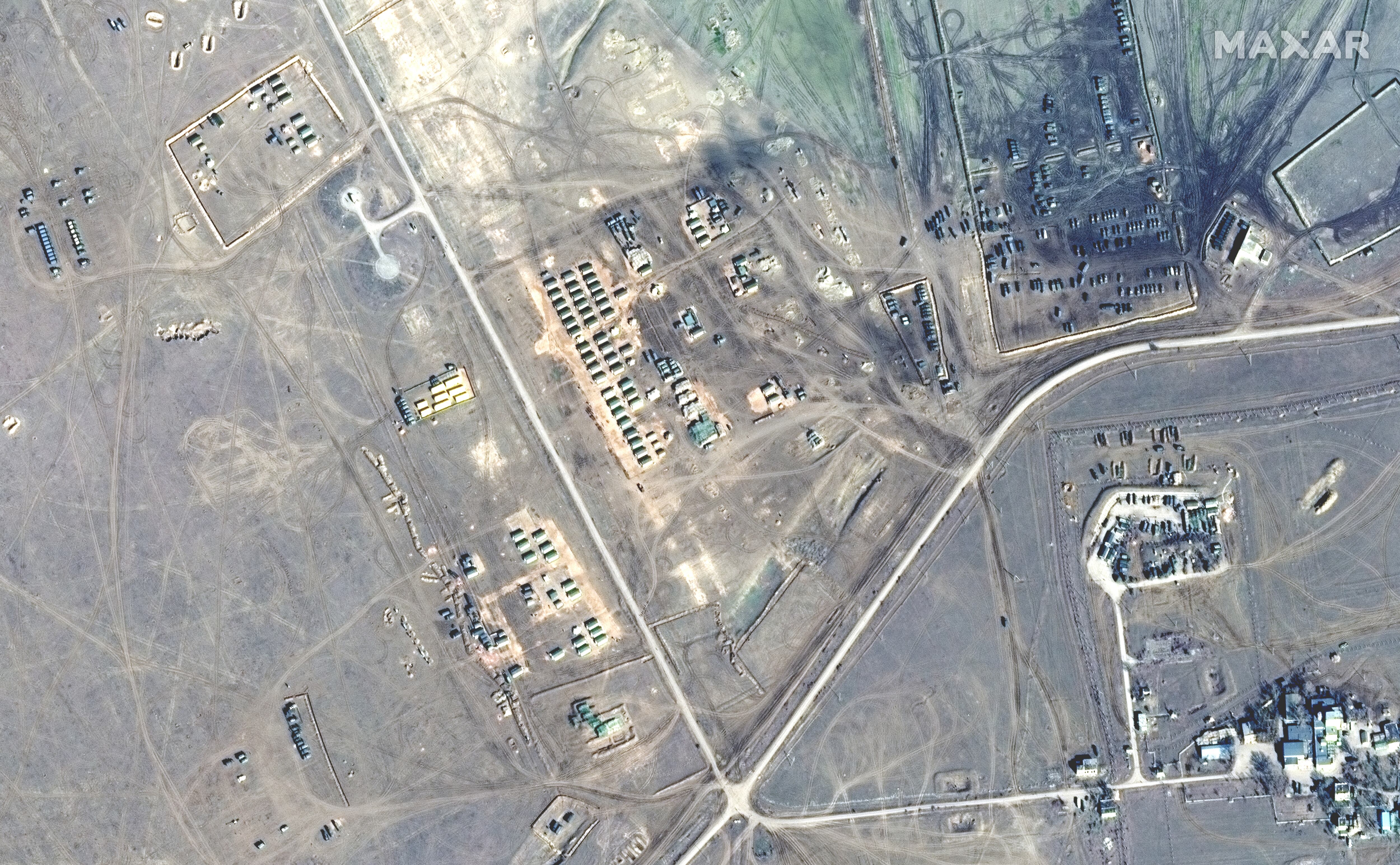 Overview shows equipment and troop tents at Opuk training area, Crimea, Feb. 15, 2022 (Satellite image ©2022 Maxar Technologies)