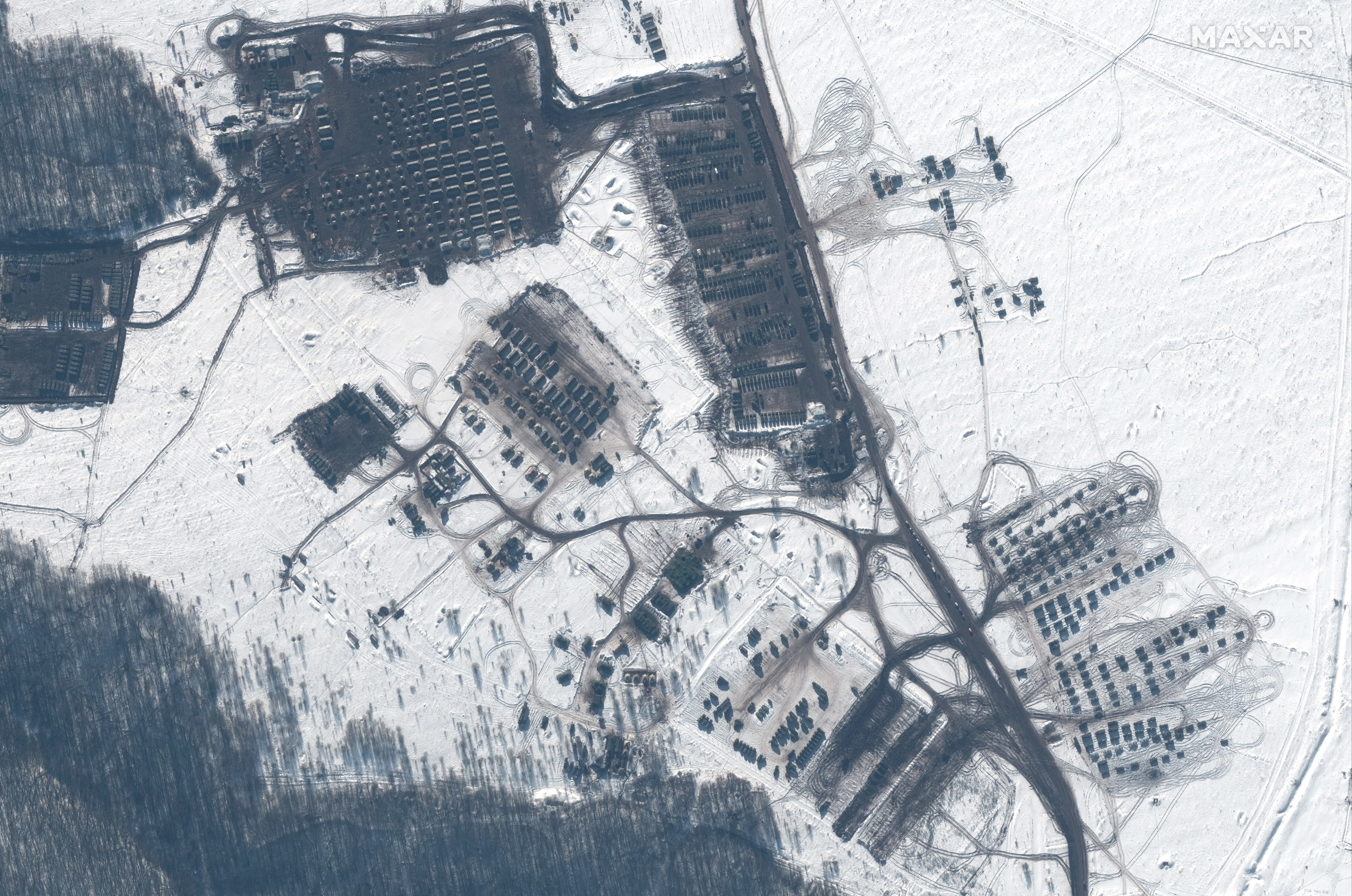 Overview shows troops and equipment at Kursk training area, Russia, Feb. 14, 2022 (Satellite image ©2022 Maxar Technologies)