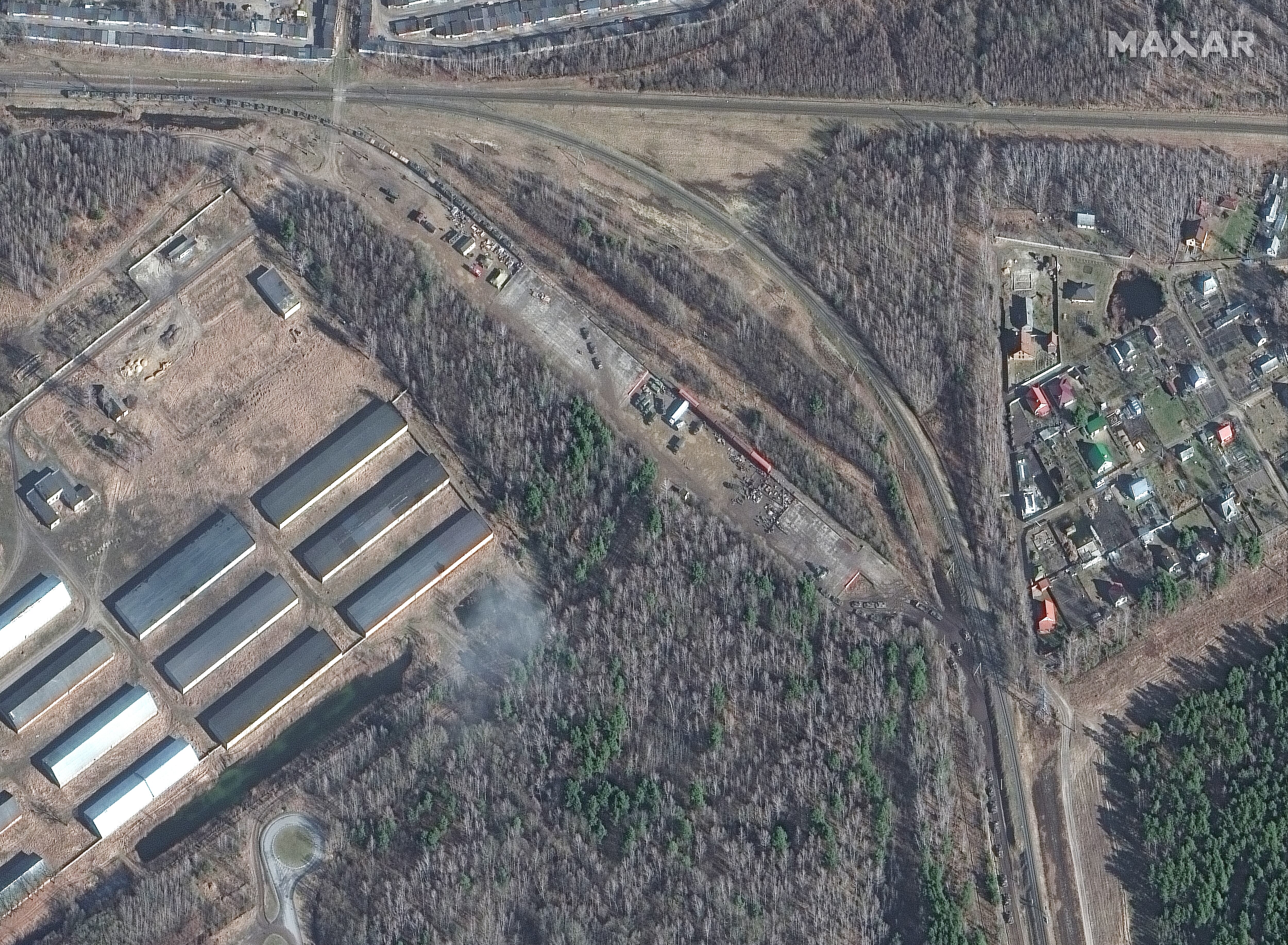 Overview shows armor and equipment at a railyard in Brest, Belarus, Feb. 24, 2022 (Satellite image ©2022 Maxar Technologies)