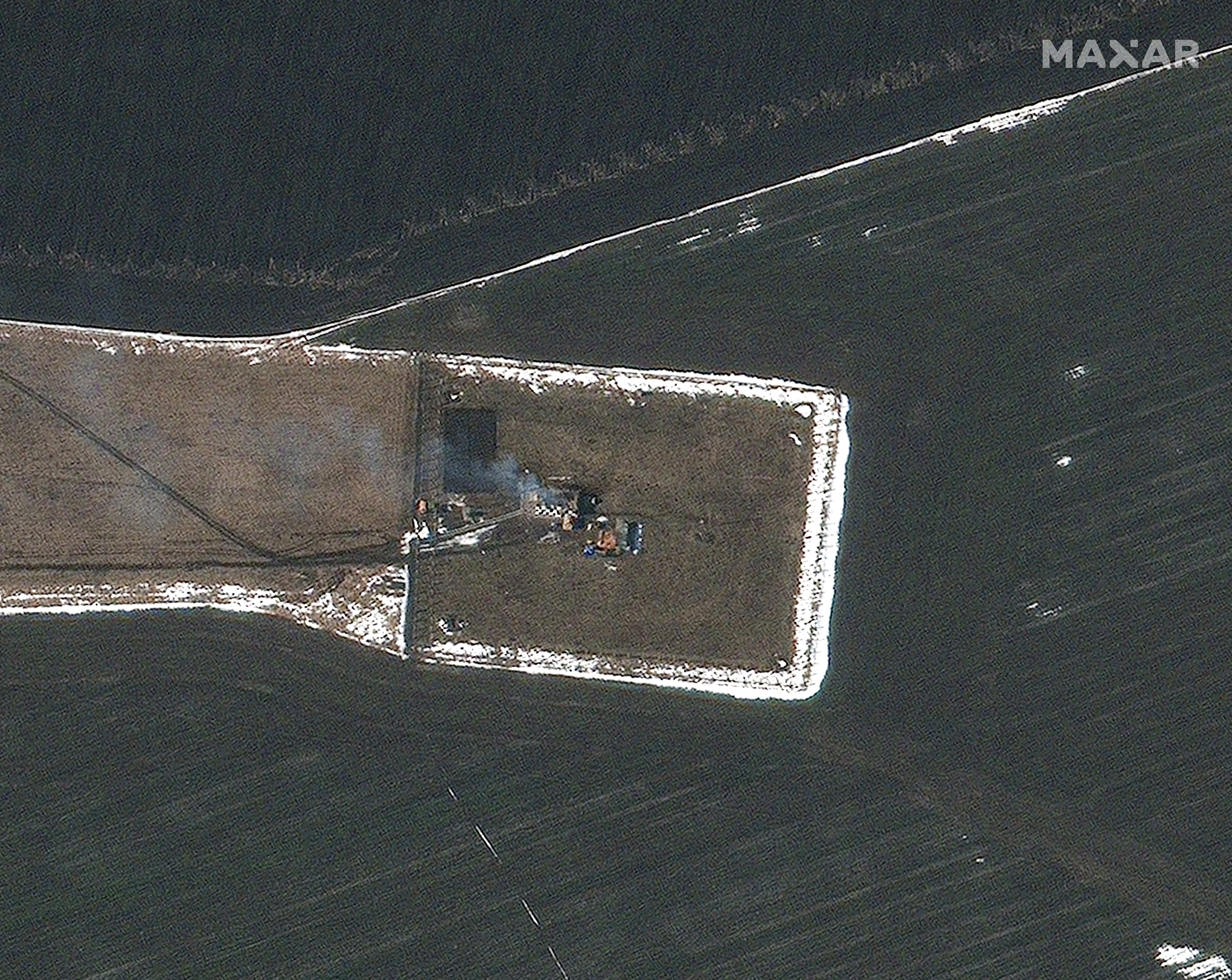 Overview shows Russian forces with artillery and multiple rocket launchers west of Belgorod, Russia, Feb. 24, 2022 (Satellite image ©2022 Maxar Technologies)