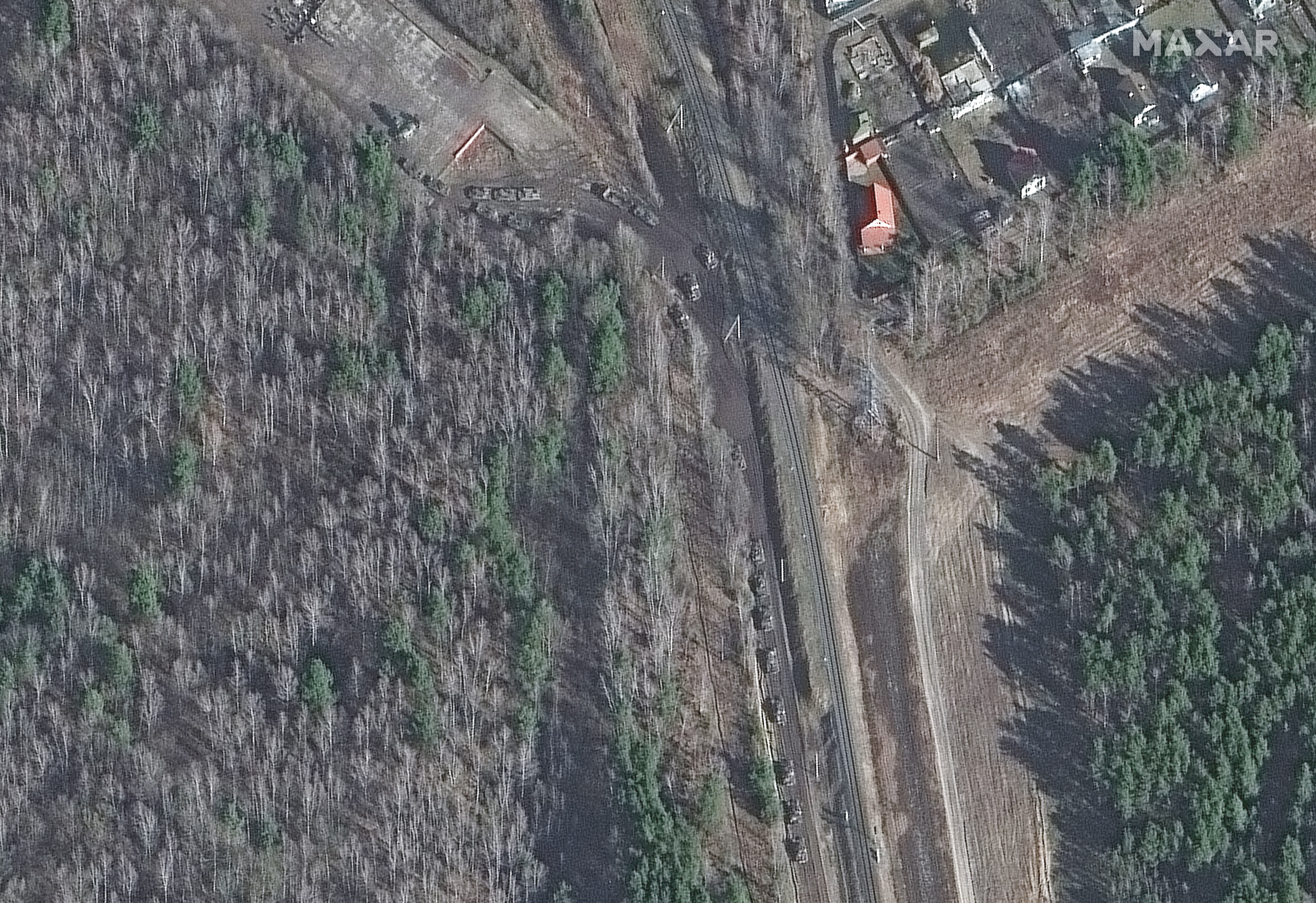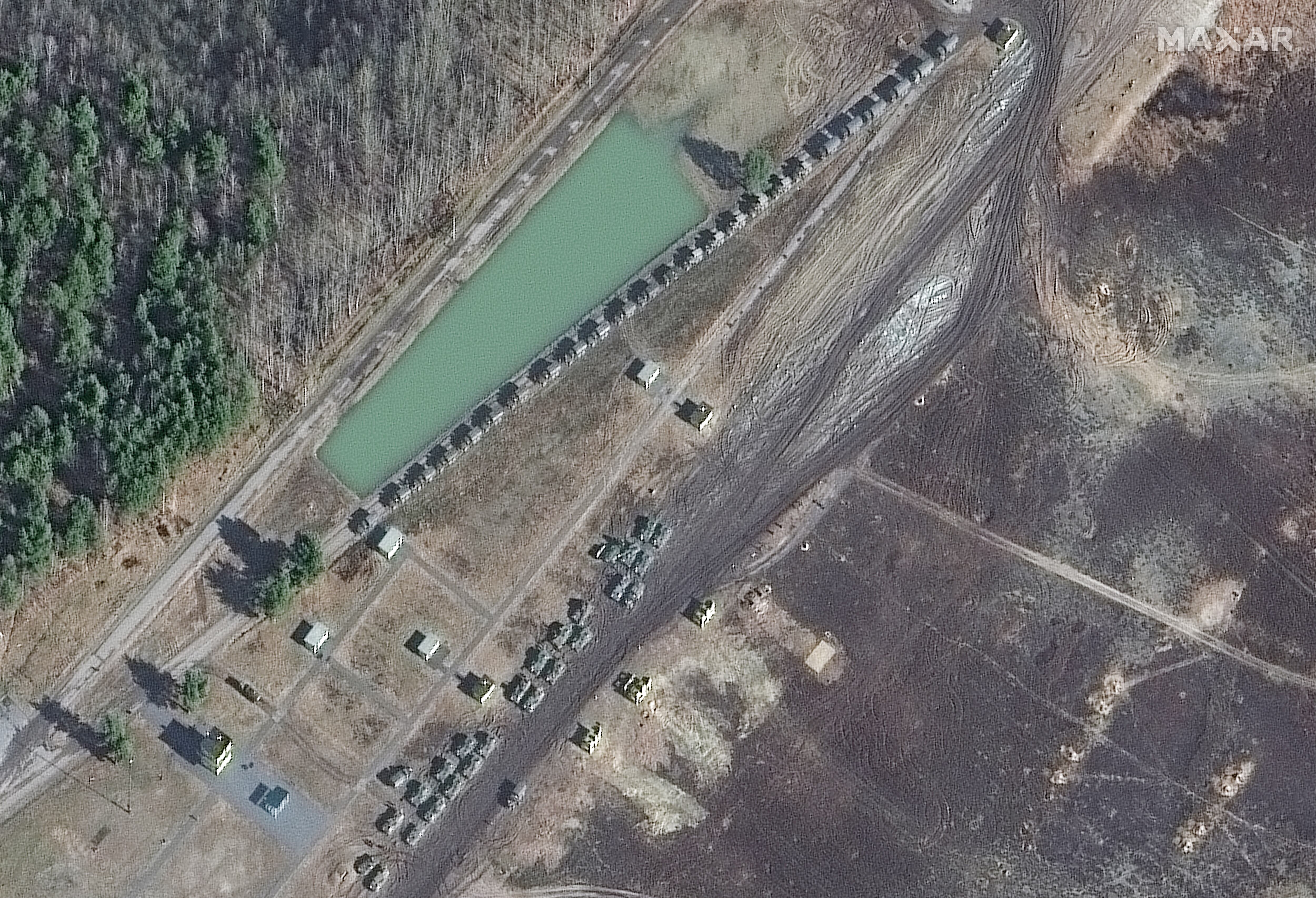 Overview shows ground forces deployed near Krasnaya Yaruga, Russia, Feb. 24, 2022 (Satellite image ©2022 Maxar Technologies)
