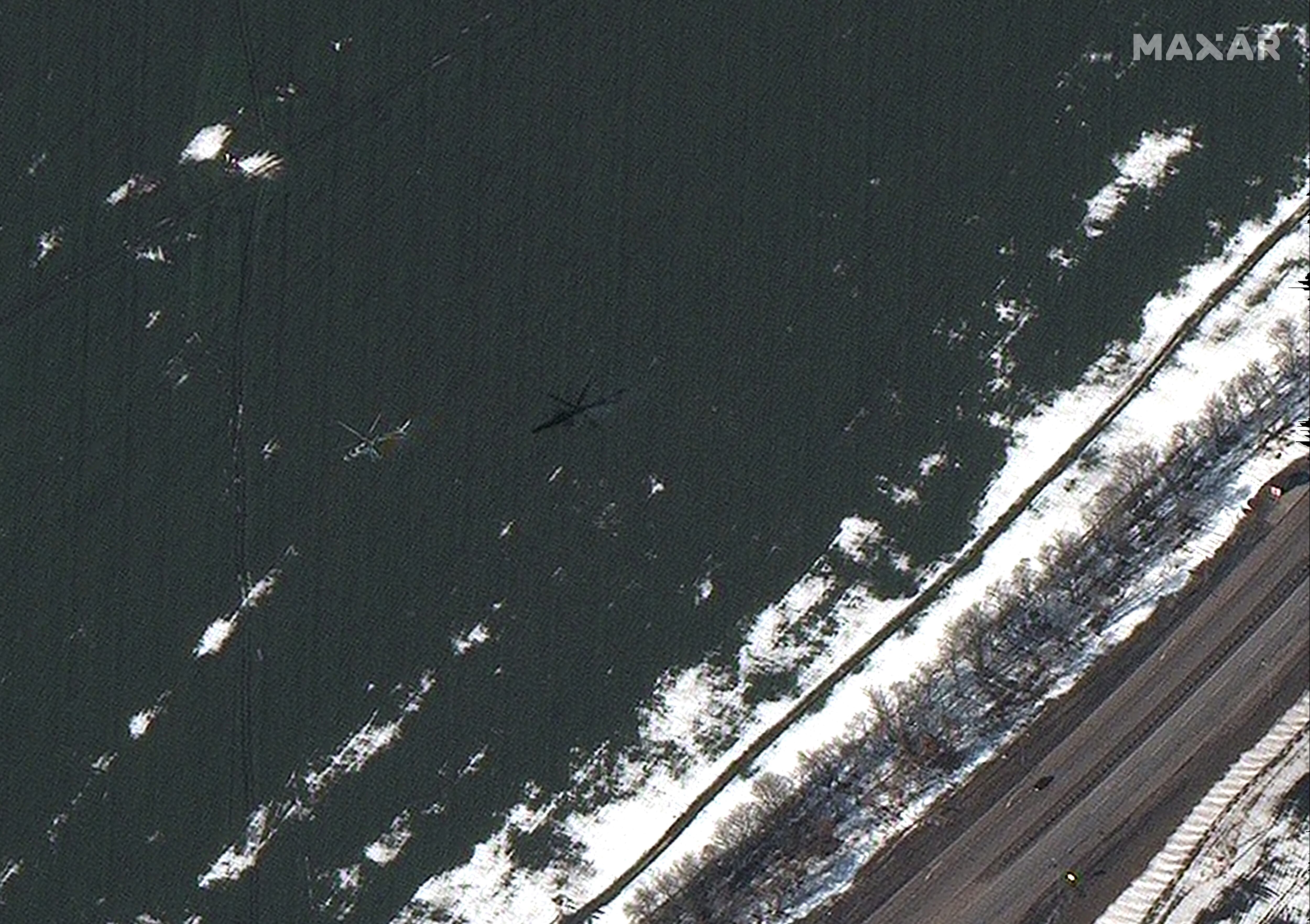 Overview shows a newly deployed ground attack helicopter near Tomarovka, Russia, Feb. 24, 2022 (Satellite image ©2022 Maxar Technologies)