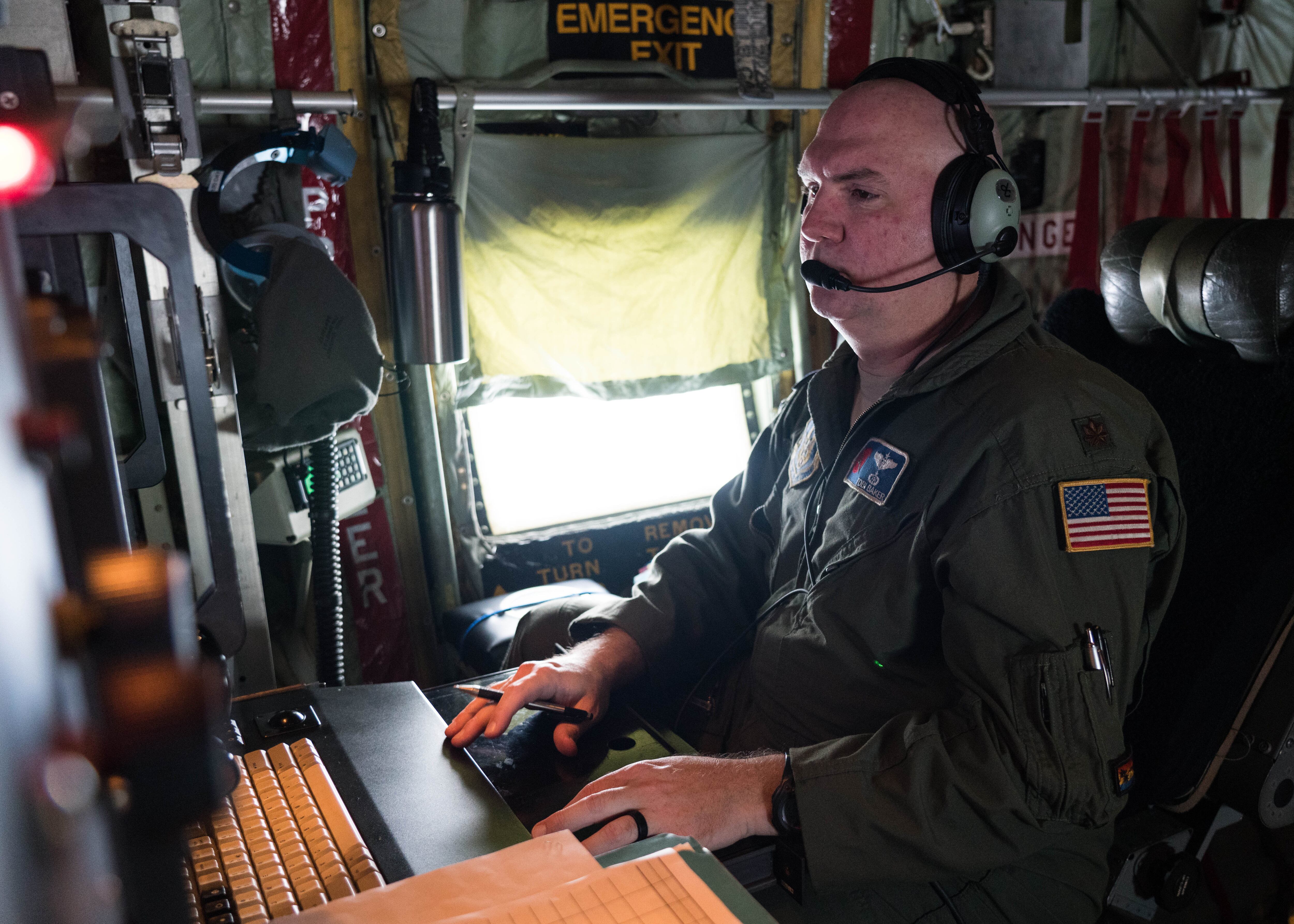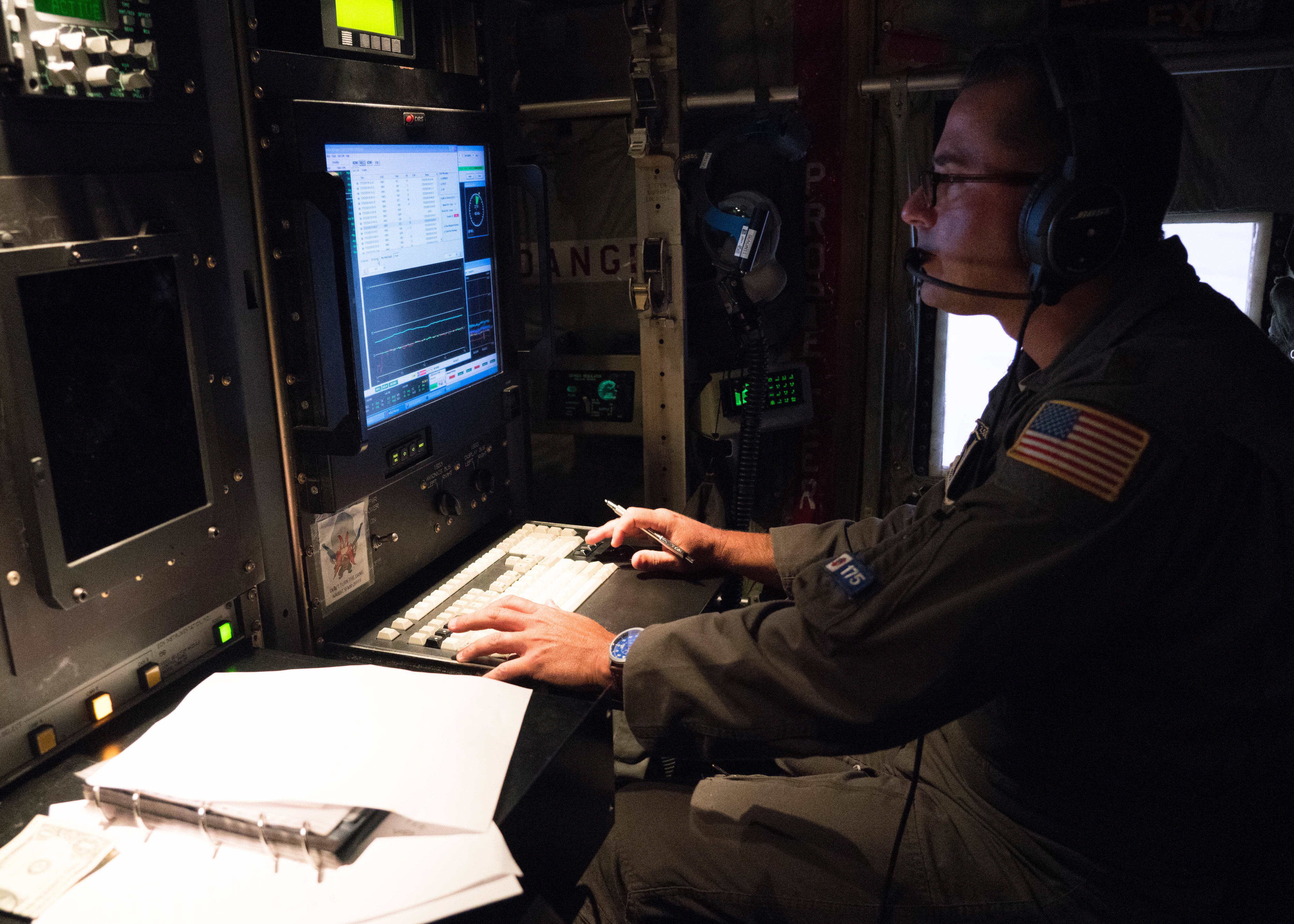 An Air Force Reserve Hurricane Hunter aircrew flies into Hurricane Douglas July 24, 2020, to collect weather data to assist the Central Pacific Hurricane Center with their forecasts. (Lt. Col. Marnee Losurdo/Air Force)Air Force Reserve Hurricane Hunters use dropsondes to collect weather data such as wind speed, wind direction, pressure and temperature. Several of these were dropped into Hurricane Douglas July 24, 2020, The data the Air Force Reserve Hurricane Hunters collect is send to the Central Pacific Hurricane Center to assist with their forecasts. (Lt. Col. Marnee Losurdo/Air Force)Maj. Tobi Baker, 53rd Weather Reconnaissance Squadron aerial reconnaissance weather officer, reviews weather data collected while flying in Hurricane Douglas July 26, 2020. The Air Force Reserve Hurricane Hunter aircrew flew into the first hurricane of the Pacific season to collect weather data to assist the Central Pacific Hurricane Center with their forecasts. The 53rd WRS, assigned to the 403rd Wing at Keesler Air Force Base, Mississippi, departed July 22 to conduct operations out of Barbers Point Kapolei Airport, Hawaii. (Lt. Col. Marnee Losurdo/Air Force)Capt. Patrick Tift, pilot for the 53rd Weather Reconnaissance Squadron at Keesler Air Force Base, Miss., flies the WC-130J Super Hercules aircraft into Hurricane Douglas from Barbers Point Kapolei Airport, Hawaii, July 26, 2020. (Senior Airman Kristen Pittman/Air Force)Maj. Douglas Gautrau, aerial reconnaissance weather officer with the 53rd Weather Reconnaissance Squadron, reviews weather data collected during a mission into Hurricane Douglas July 24, 2020. The data is sent to the Central Pacific Hurricane Center to assist with their forecasts. (Lt. Col. Marnee Losurdo/Air Force)