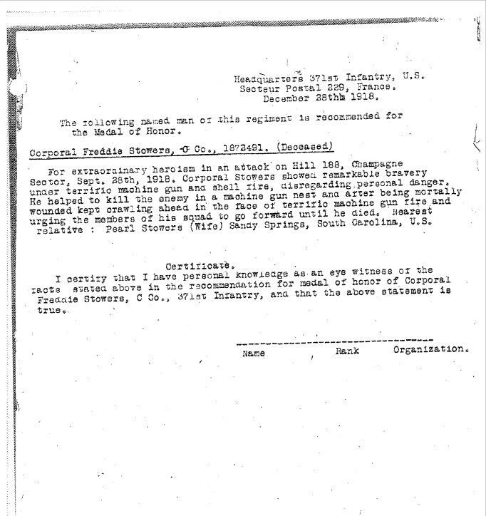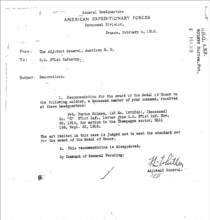Stowers' nomination for Medal of Honor. "If [Stowers is] the criteria for a Medal of Honor, and Holmes is on that same level, was that recommendation downgraded based on racism?" said Knapp. Courtesy of Jeff Gusky.Burton Holmes' nomination for Medal of Honor. There are no known photographs of Holmes. We don't know what he looked like or what his history is. We know he was illiterate; he signed his draft card with an "x," according to Gusky. Courtesy of Jeff Gusky.Burton Holmes' Medal of Honor nomination was disapproved. Holmes' story is important whether or not the medal is upgraded, said Gusky, because it represents what it means to be an American. Courtesy of Jeff Gusky.