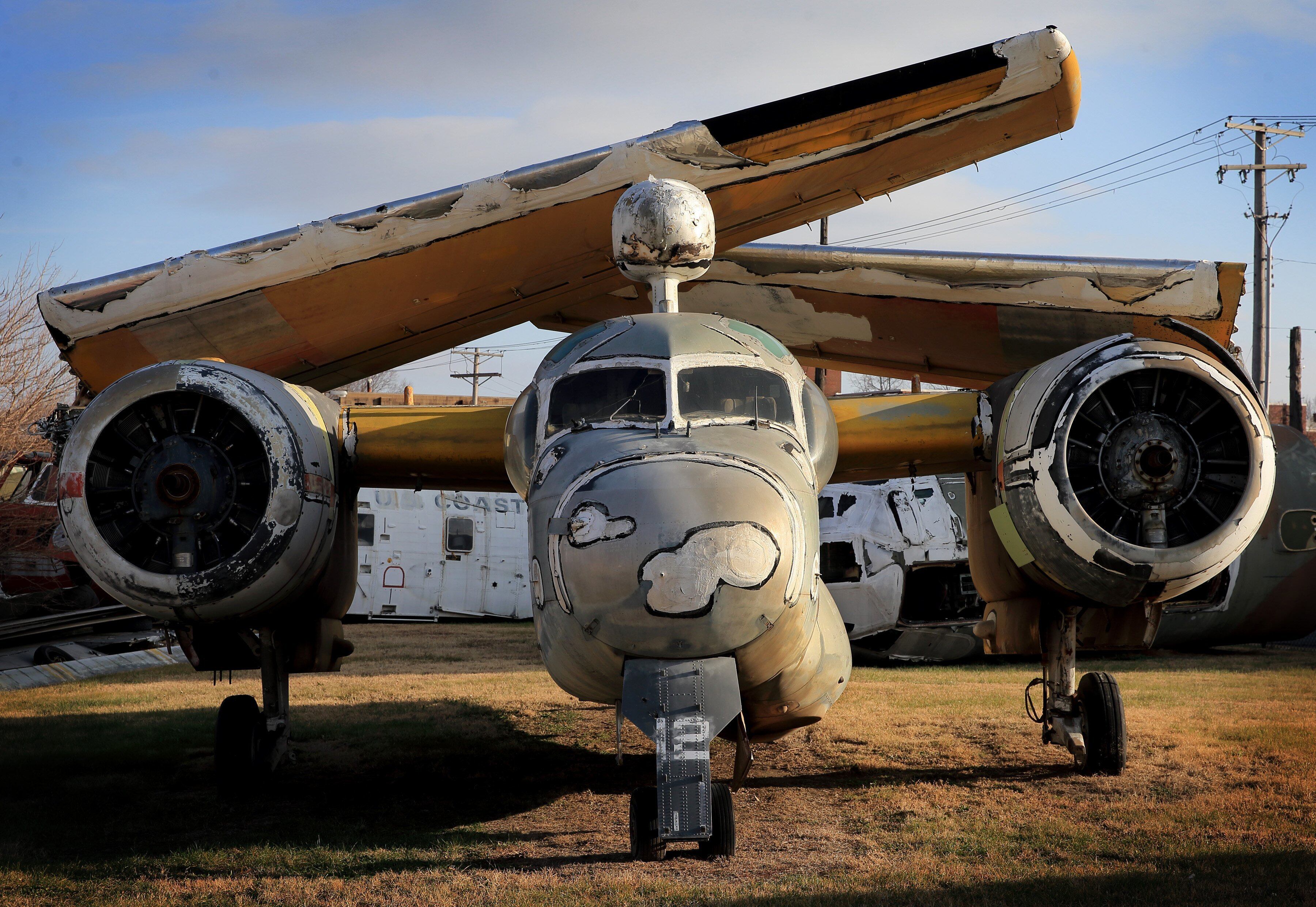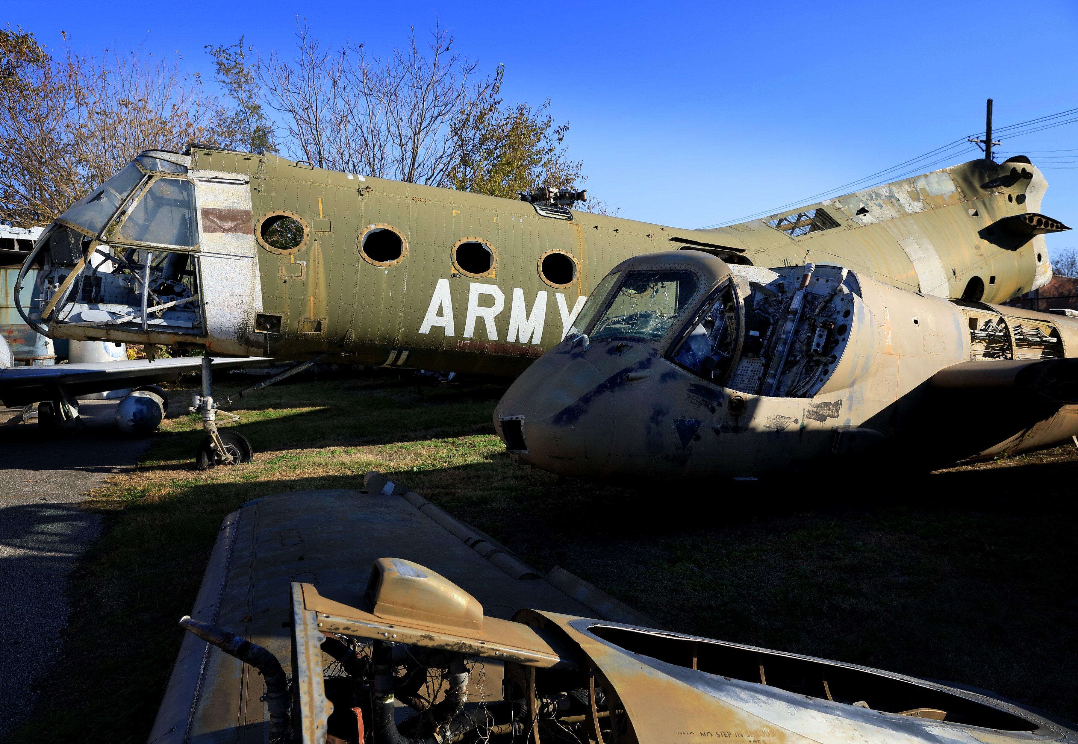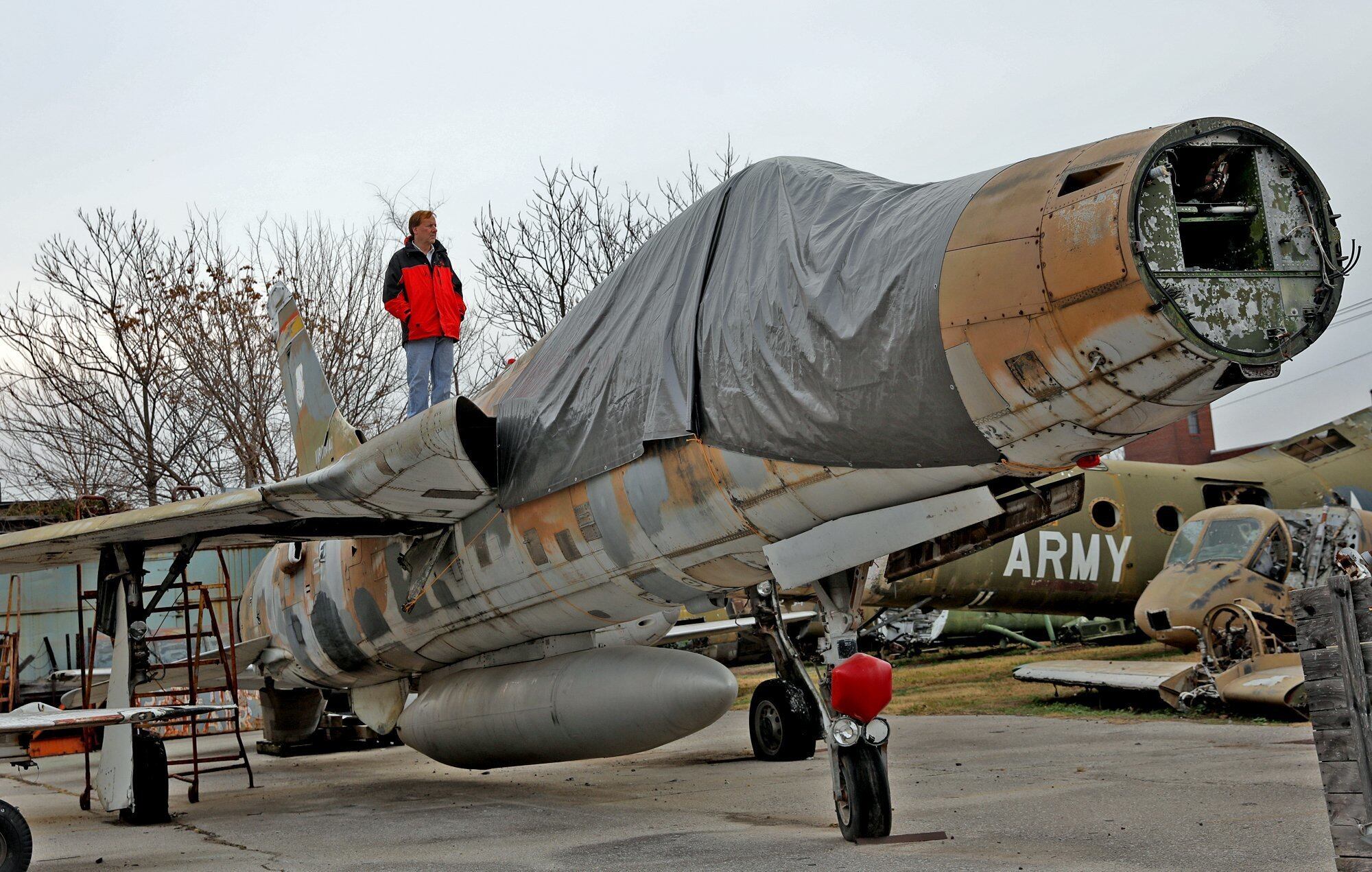 Dan Bissell, owner of Bissell Auto & Body, poses for a portrait in front an engine of a Grumman S-2 Tracker stored at Bissell Auto & Body truck repair in St. Louis on Friday, Dec. 22, 2017. Bissell has been buying surplus military planes and helicopters for 25 years. He has a collection of parts from nearly whole planes to wings to engines and landing gear from 26 aircraft he purchased from government auctions. He has both American and Soviet military hardware. (Laurie Skrivan/St. Louis Post-Dispatch via AP)Dan Bissell stands on an F-105 jet stored at Bissell Auto & Body truck repair on Chouteau Avenue in St. Louis on Friday, Dec. 22, 2017. Bissell, the owner of Bissell Auto & Body, has been buying surplus military planes and helicopters for 25 years. He has a collection of parts from nearly whole planes to wings to engines and landing gear from 26 aircraft he purchased from government auctions. He has both American military and Soviet military hardware. Friday, Dec. 22, 2017. (Laurie Skrivan/St. Louis Post-Dispatch via AP)This Thursday, Dec. 21, 2017 photo shows a Grumman S-2 Tracker stored at Bissell Auto & Body truck repair on Chouteau Avenue in St. Louis. Dan Bissell, the owner of Bissell Auto & Body, has been buying surplus military planes and helicopters for 25 years. He has a collection of parts from nearly whole planes to wings to engines and landing gear from 26 aircraft he purchased from government auctions. He has both American military and Soviet military hardware. (David Carson/St. Louis Post-Dispatch via AP)This Thursday Nov. 16, 2017 photo shows a Piasecki H-21 flying banana and an OV-1 Mohawk stored at Bissell Auto & Body truck repair on Chouteau Avenue in St. Louis. Dan Bissell, the owner of Bissell Auto & Body truck repair, has been buying surplus military planes and helicopters for 25 years. He has collection of parts from hulls to wings to engines and landing gear from 26 aircraft he purchased from government auctions. He has both American military and Soviet military hardware. (David Carson/St. Louis Post-Dispatch via AP)This Thursday Nov. 16, 2017 photo shows a hatch on a Grumman S-2 Tracker stored at Bissell Auto & Body truck repair on Chouteau Avenue in St. Louis. Dan Bissell, the owner of Bissell Auto & Body, has been buying surplus military planes and helicopters for 25 years. He has a collection of parts from nearly whole planes to wings to engines and landing gear from 26 aircraft he purchased from government auctions. He has both American military and Soviet military hardware. (David Carson/St. Louis Post-Dispatch via AP)This Thursday, Nov. 16, 2017 photo shows the cockpit of a Soviet MiG-17 stored at Bissell Auto & Body truck repair on Chouteau Avenue in St. Louis. Dan Bissell, the owner of Bissell Auto & Body, has been buying surplus military planes and helicopters for 25 years. He has a collection of parts from nearly whole planes to wings to engines and landing gear from 26 aircraft he purchased from government auctions. He has both American military and Soviet military hardware. (David Carson/St. Louis Post-Dispatch via AP)This Thursday, Nov. 16, 2017 photo shows engine throttle controllers in the cockpit of a B-52 bomber stored at Bissell Auto & Body truck repair on Chouteau Avenue in St. Louis. Dan Bissell, the owner of Bissell Auto & Body, has been buying surplus military planes and helicopters for 25 years. He has a collection of parts from nearly whole planes to wings to engines and landing gear from 26 aircraft he purchased from government auctions. He has both American military and Soviet military hardware. (David Carson/St. Louis Post-Dispatch via AP)