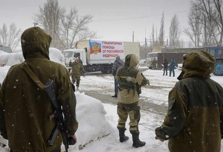 Pro-Russian soldiers welcome a Russian convoy of 12 trucks transporting humanitarian goods for pro-Russian soldiers on Nov. 30 in the eastern city of Donetsk, Ukraine.
