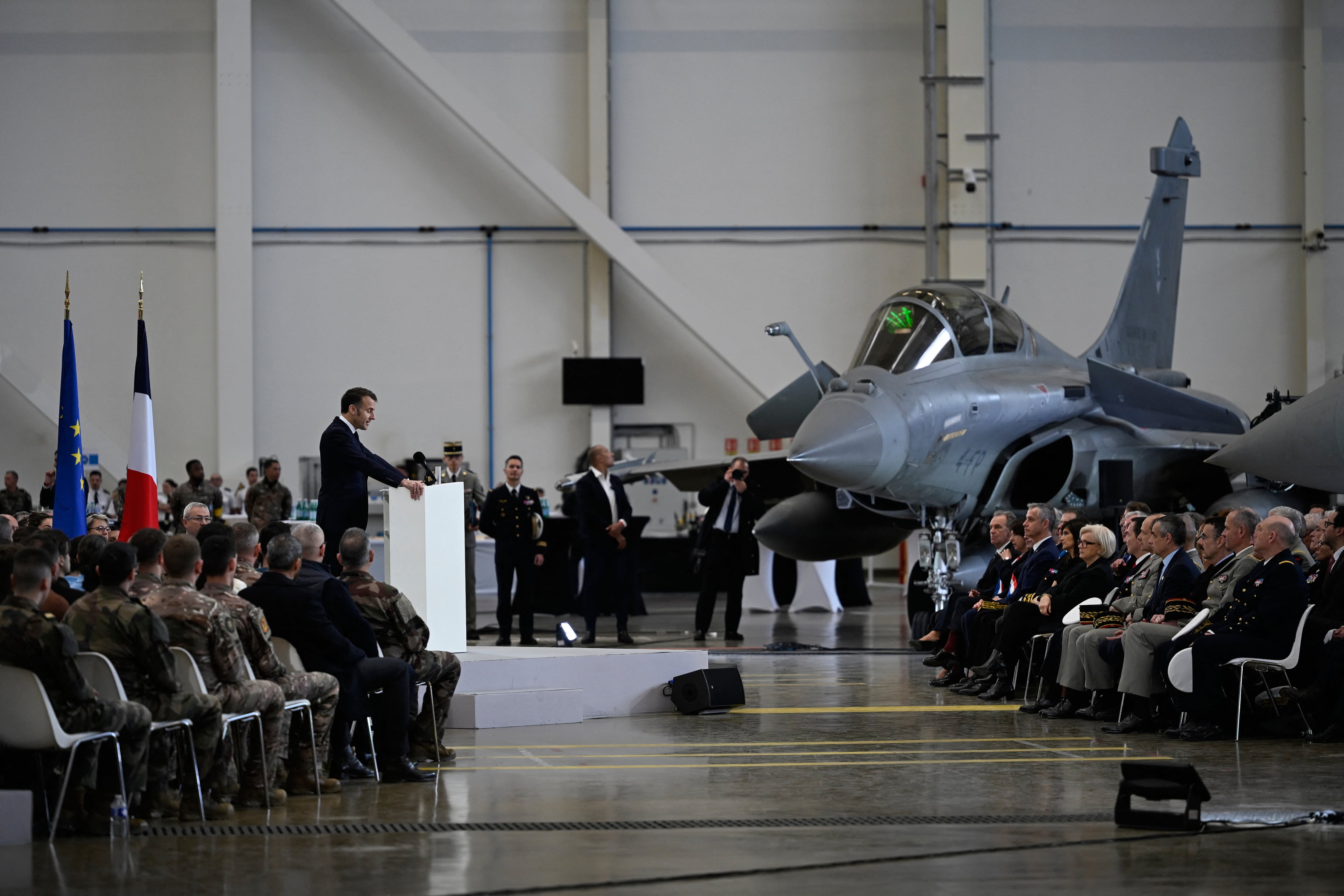 “I need defense manufacturers who also take a more clear-eyed view of the competition, and to whom I say, go faster, go stronger, mass produce, produce lighter, respond to demands,” Macron said. “I will always with our armed forces be at your side, but we also must be more European, and so we must be more European in our own purchases.”