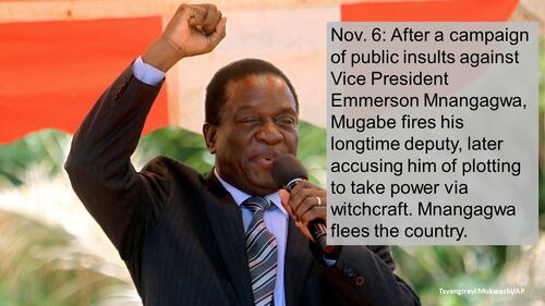 Recently fired Vice President Emmerson Mnangagwa would take over as the country’s leader within 48 hours, said a ruling party official, Lovemore Matuke. Mnangagwa, who fled the country after his firing on Nov. 6, “is not far from here,” Matuke said.