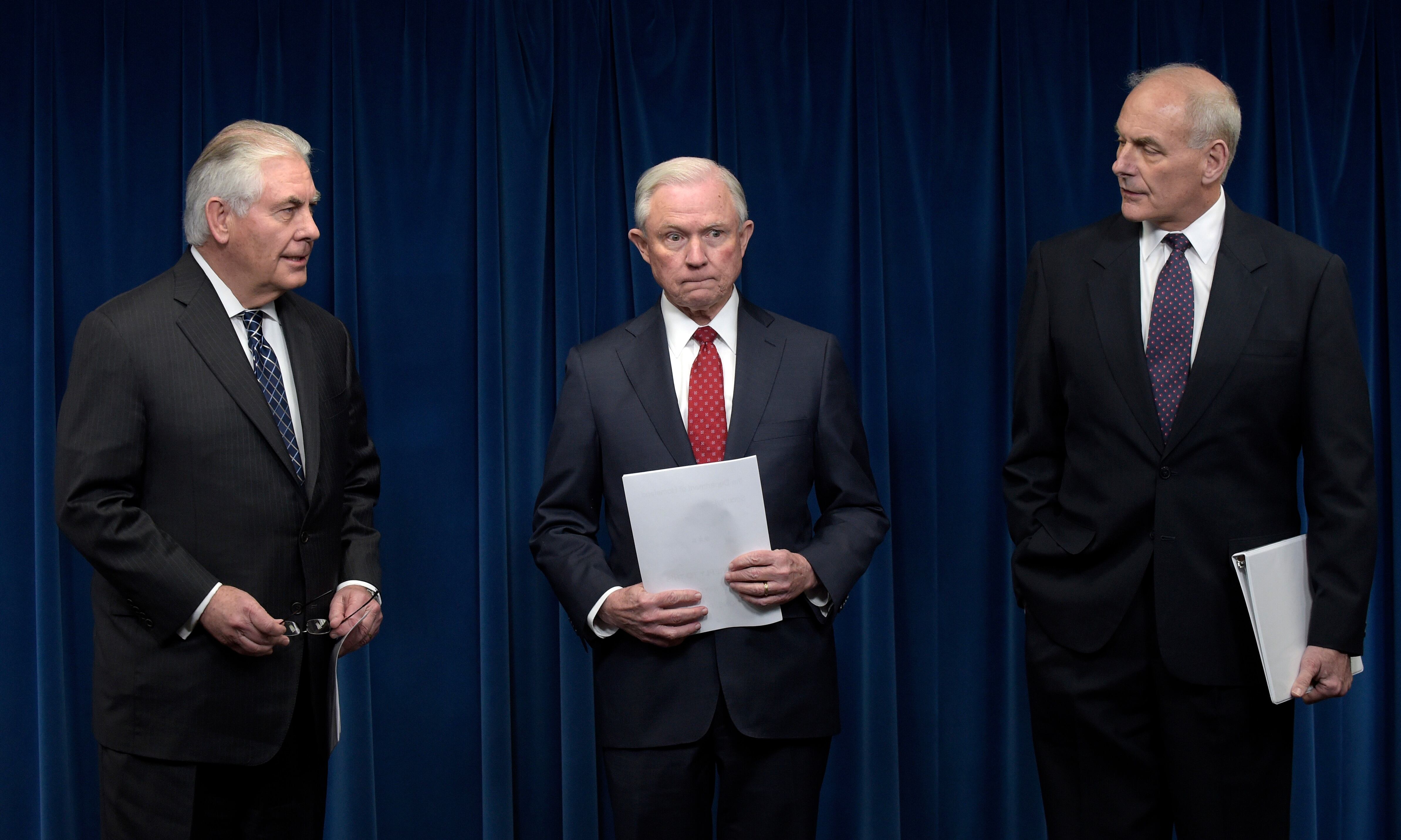 But three of Trump’s Cabinet members — Department of Homeland Security Secretary John Kelly, Secretary of State Rex Tillerson and Attorney General Jeff Sessions — appeared in a brief press conference after the signing to defend both the legal basis for the order and the pressing need for action.