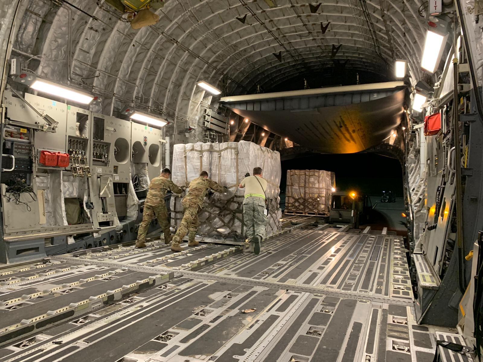 All told, the journey lasted four days. The crew took off from Al Udeid Air Base in Qatar on April 1, flying into Ramstein Air Base in Germany before landing at Aviano on April 2. They were on the ground in Italy for only about an hour, enough time for airmen to roll pallets stacked high with plastic-wrapped test kits into the body of aircraft.