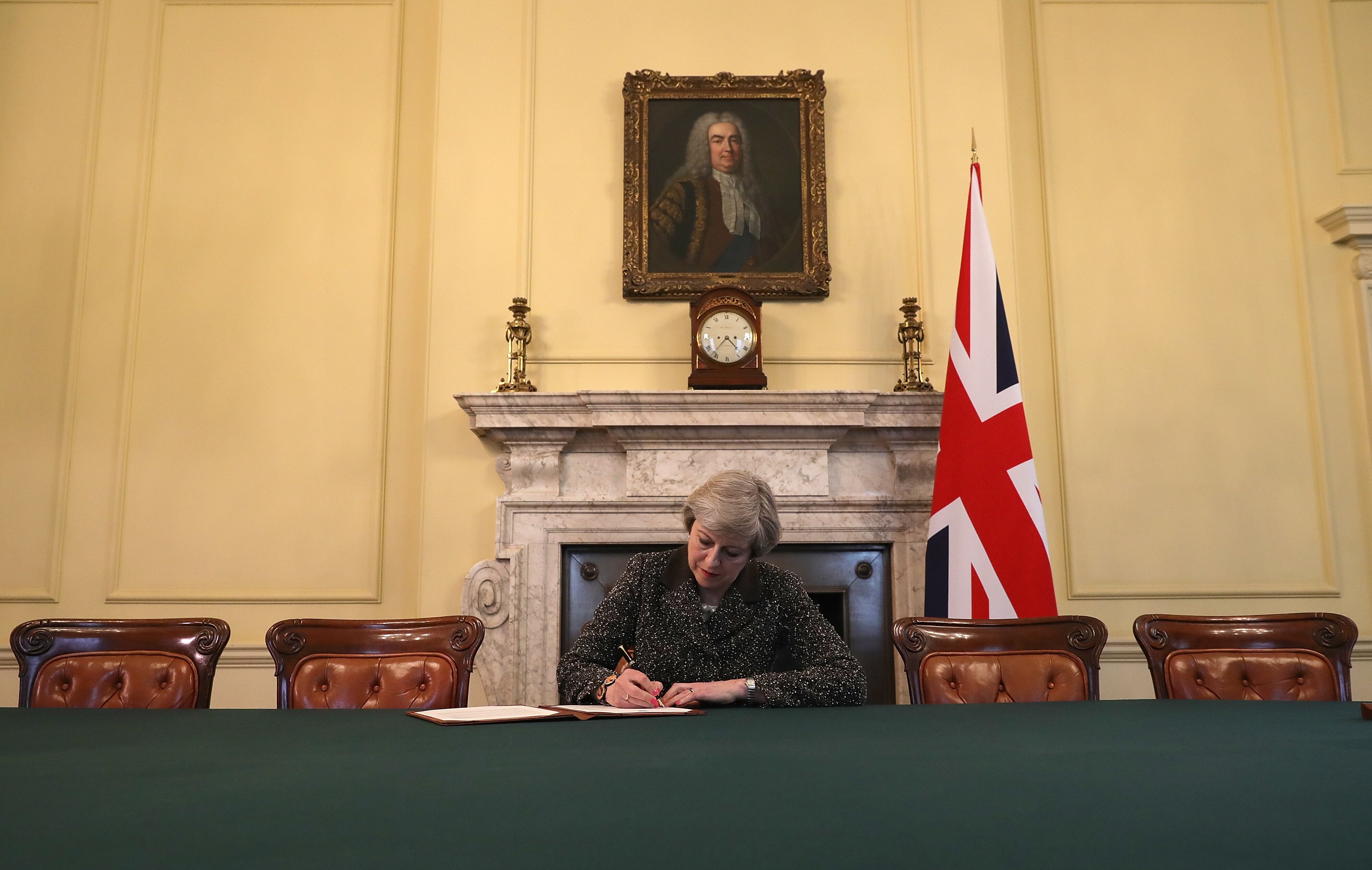 British Prime Minister Theresa May on March 28, 2017, signs the official letter in London, England, to European Council President Donald Tusk invoking Article 50 and the U.K.'s intention to leave the European Union.